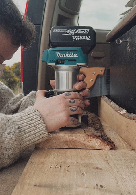 Another thing I mentioned in my last monthly round-up was the end of my time in my workshop. I had a few weeks still in Findhorn after I’d cleared it out though, and wanted to be able to still make wooden signs if I got any orders. Luckily, past-Amy was pretty smart and made sure all the power tools were cordless, so I can work from anywhere as long as I have some kind of flat surface, and nobody around me to be upset by the noise.