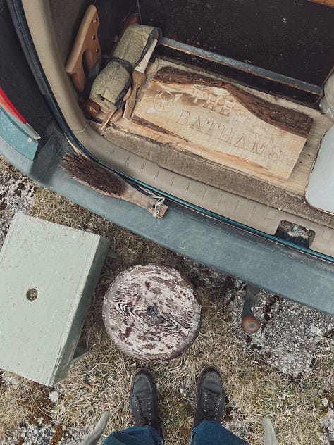 Woodwork in the boot of a car, a cottage and leaving our spot.